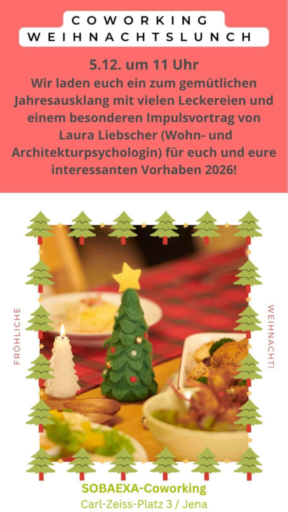 In diesen Rahmen gibt Laura Liebscher einen kurzen Impuls zu Wohlfühlatmosphäre in Räumlichkeiten. Sie gewährt uns Einblicke in ihre Arbeit und die Prinzipien der Architekturpsychologie – ein Anlass, die Wirkung von Räumen neu zu entdecken und Impulse mit ins neue Jahr zu nehmen.